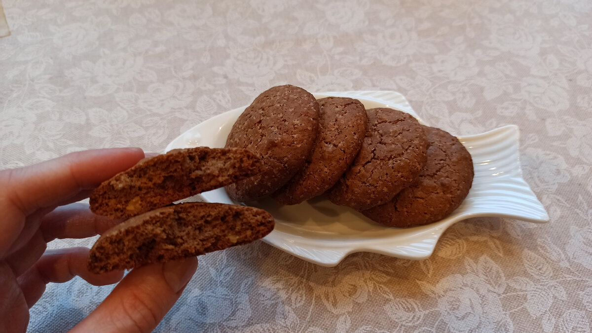 Всем привет! Хотела написать нормальный пост с раскладкой по граммам, но потом все пошло не по плану. Дочка нечаянно пролила половину аквафабы (бульона от зеленого горошка). Что то-то там на дне осталось, решили взбить эти остатки. Получилась хорошая такая пена. Прикинули, что на 1 маленький лист тесто все-таки получится, и принялись делать замес. Все делали на глаз. В миску насыпали чуток сахара, добавили пару ложек какао-порошка, немного муки зеленой гречки, четверть ч/л американской соды, 1 горсть измельчённых грецких орехов. Перемешали. В аквафабу добавили ложки пару ложек рисового масла, размешали и соеденили сухие ингредиенты с жидкими. Чуть не забыли уксус, добавили в последний момент 1 ч/л рисового 3% Далее мокрыми руками скатались лепешки – 9 шт и распределились по противню. Он у меня маленький 35*34,5 , а сама духовка на 45 см. Выпекали 18 минут при 180 градусах. Готовое печение получилось с хрустящей корочкой и с мягкой серединкой. По внешнему виду напомнило овсяное