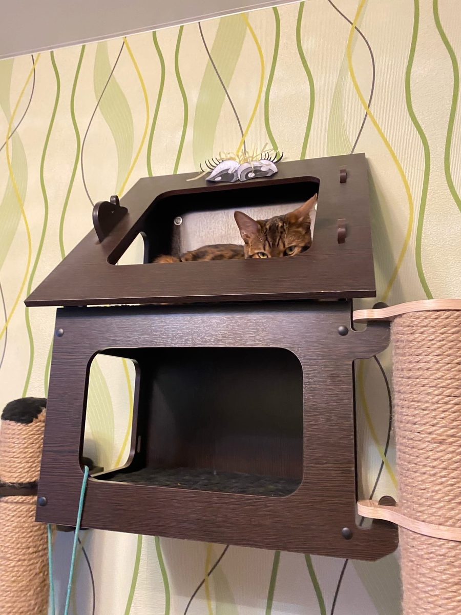 Особенно приятно наблюдать, как кошка не просто понюхала, повела лапкой и ушла, а оценила мои старания и целыми днями путешествует по этажам. Тут полежала, там поточила когти, забралась по канату, спрыгнула на другую полочку и куча других важных кошачьих дел...