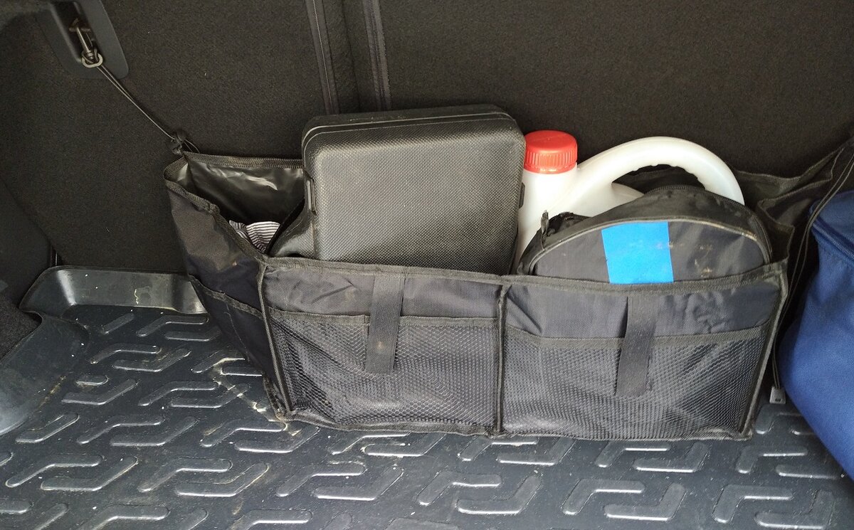 - Поскольку органайзер не закреплён жёстко, то на кочках он подпрыгивает, и, соответственно, из багажника слышны стуки. Было бы лучше, если бы кроме шнурков на задней стенке органайзера имелись бы липучки (как на моей сумке набора автомобилиста).
