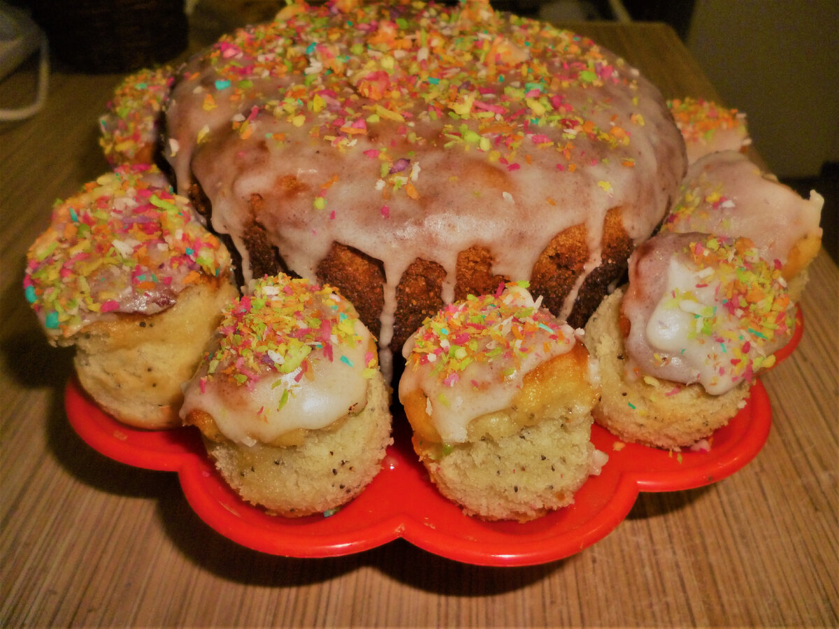 "Шапочки" куличиков смазываем глазурью, посыпаем яркими посыпками или стружкой. Или делаем украшения на свой вкус.