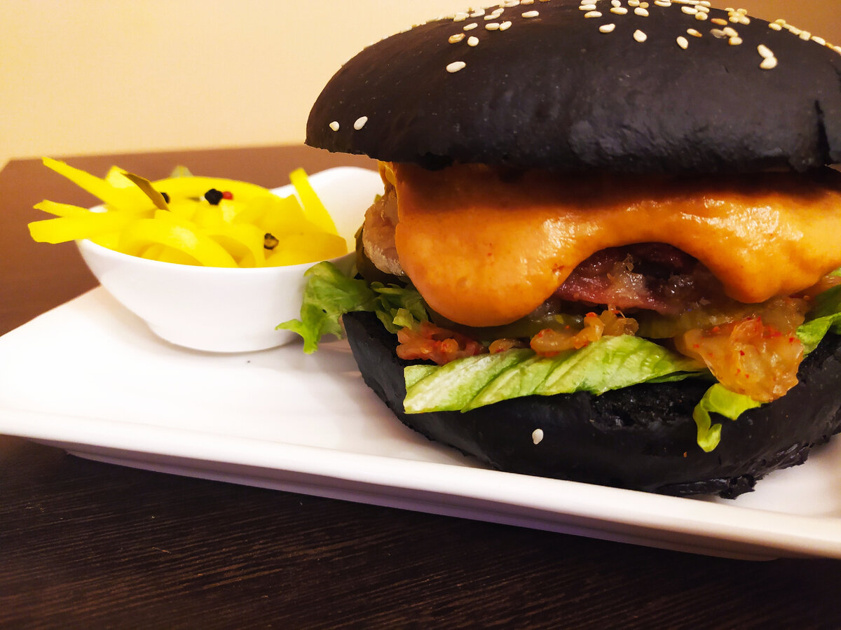 Курица в рисовом кляре с пармезаном, сырный соус и кимчи. На 3 сэндвича 3 булочки для сэндвичей