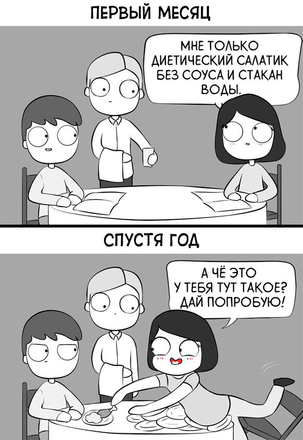 Отношения между людьми - это поистине необъятная тема, на которую уже созданы тысячи весёлых комиксов - и в будущем будет создана ещё не одна сотня! Людям всегда интересно читать про то, что близко им самим, а талантливые художники благодаря внимательности и богатой фантазии то и дело подмечают необычные и весёлые моменты, благодаря которым комиксы на эту тему и приобрели такую популярность! В самом начале отношений и девушка и молодой человек сизо всех сил стараются показать себя с самой лучшей стороны - это абсолютно логично и нормально, но всё же стоит признать, что в такие моменты они оба отыгрывают некую роль "идеального партнёра", при этом их истинная натура нередко прячется за этой маской! Но прелесть отношений в том, что людям не нужны идеальные люди - это быстро надоедает и у многих может появиться впечатление, что они встречаются с роботом! И девушки и парни любят своих вторых половинок вместе со всеми их изъянами - и иногда то, что кажется человеку неприемлемым, для его парт