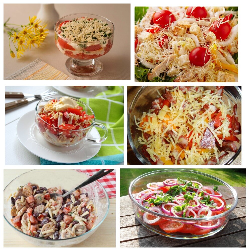Из помидор: 1.Помидоры,сыр(твёрдый,плавленный,колбасный по вкусу),чеснок,майонез,соль,перец.Можно перемешать все ингредиенты,можно переслоить помидоры сырной массой,можно нафаршировать половинки помидор. 2.Помидоры,болгарский перец,отварная курица(можно заменить п/к грудкой),сыр,майонез,соль по вкусу.Можно добавить сухарики. 3.Помидоры,крабовые палочки,сыр,чеснок,майонез,соль по вкусу. 4.Помидоры,сыр,п/к колбаса,чеснок,майонез,соль,перец по вкусу. 5.Помидоры,фасоль в собственном соку,сыр,чеснок,сухарики,майонез,соль по вкусу. 6.Помидоры,красный лук,чеснок по желанию,петрушка или кинза,соль и перец по вкусу,заправить раст.маслом или майонезом. Из болгарского перца: 1.Болгарский перец,отварная курица,конс.ананас,варёные яйца,майонез. 2.Болгарский перец,ветчина,оливки без косточек,красная фасоль в собственном соку,майонез,соль и перец по вкусу. 3.Болгарский перец,маринованные огурцы,красный лук,раст.масло,соль и перец по вкусу. 4.Болгарский перец,корейская морковь,копчёная куриная грудка,