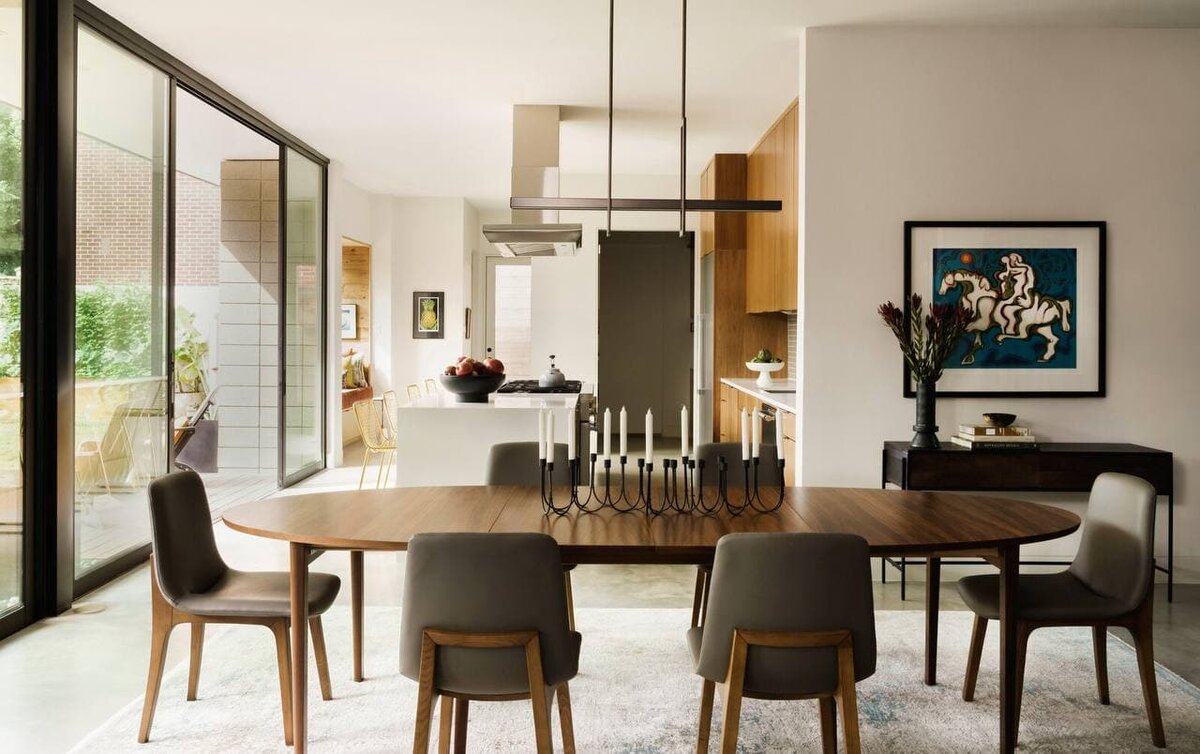 Жилые зоны открытой планировки предлагают достаточно места для дружной семьи для совместного времяпрепровождения. В столовой стол Design Within Reach может расширяться или сжиматься для размещения групп людей различного количества. Кожаные кресла тщательно отобрали во избежания окрашивания тяжелых металлов, а в подвесной подвеске Nuvo используются энергоэффективные светодиоды.