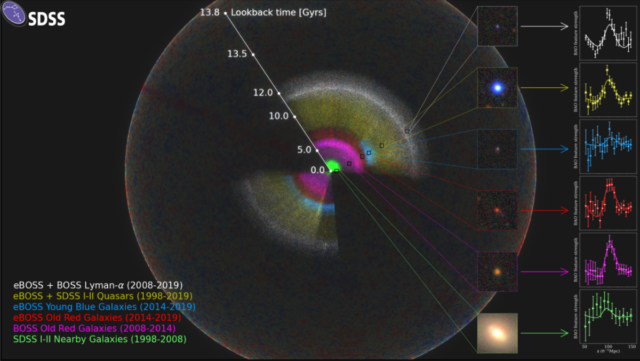 Исходя из наблюдений, проведенных при помощи обзора неба eBOSS, команда профессора Чжао выяснила подробности истории расширения космоса и роста уровня структурированности в гигантском объеме Вселенной прошлого, соответствующем расстояниям от 0,7 до 1,8 миллиарда световых лет от нас.
