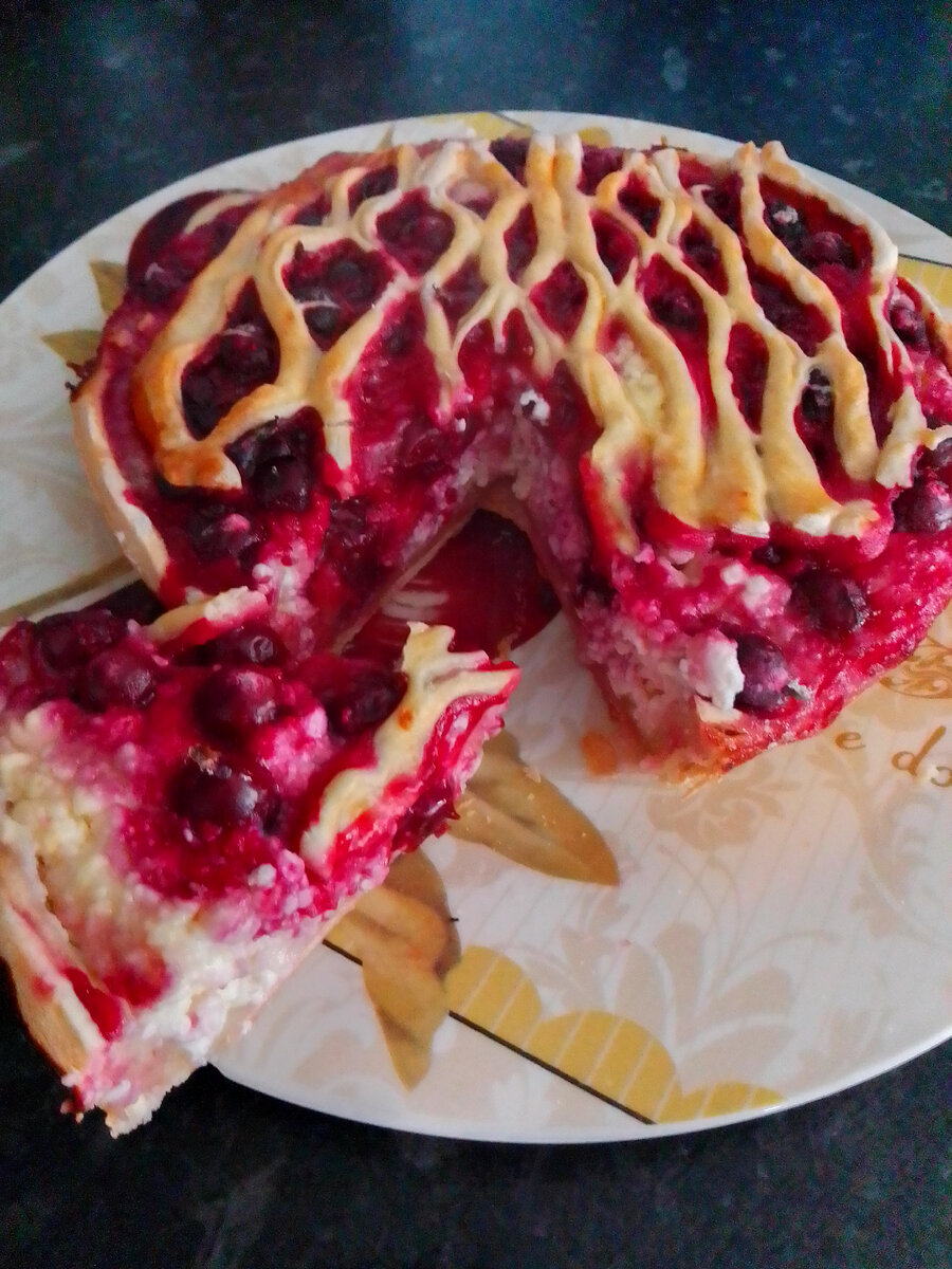Второй пласт теста я разрезала пополам и из половинки сделал декоративную решетку и выложила ее поверх начинки: