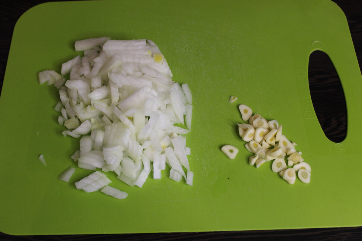 1. Лук очистить, помыть и нарезать кубиком. Чеснок очистить, помыть и нарезать.