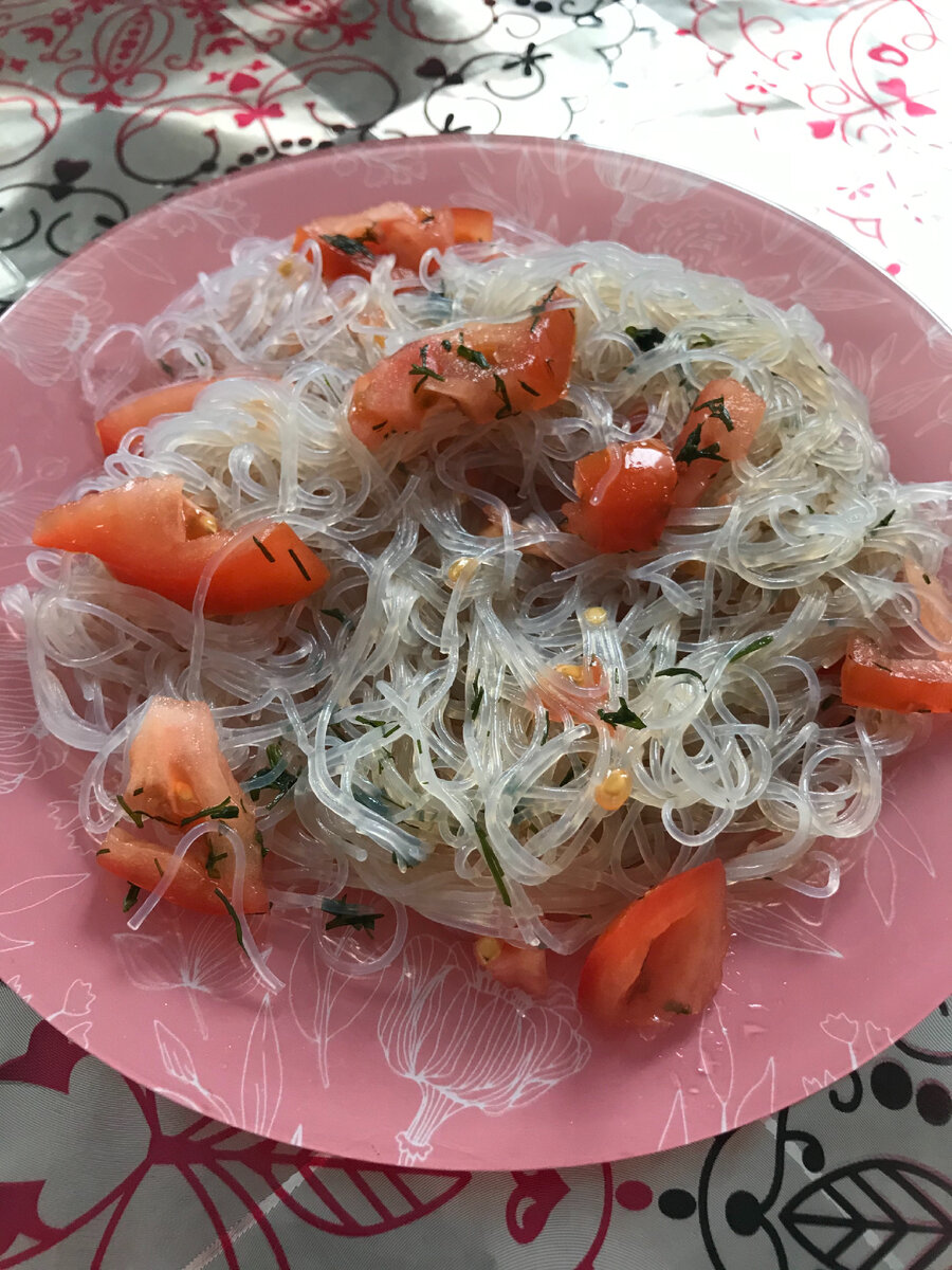 Я беру пачку фрунчозы, отвариваем ее буквально 1 -2 мин . Можно сварить целиком, можно разломать, кто не любит большую. Беру помидоры, огурцы, любую зелень. Если вы любите можно добавить грудку. Смешиваем все и заправляем соевым соусом. Приятного аппетита 😋