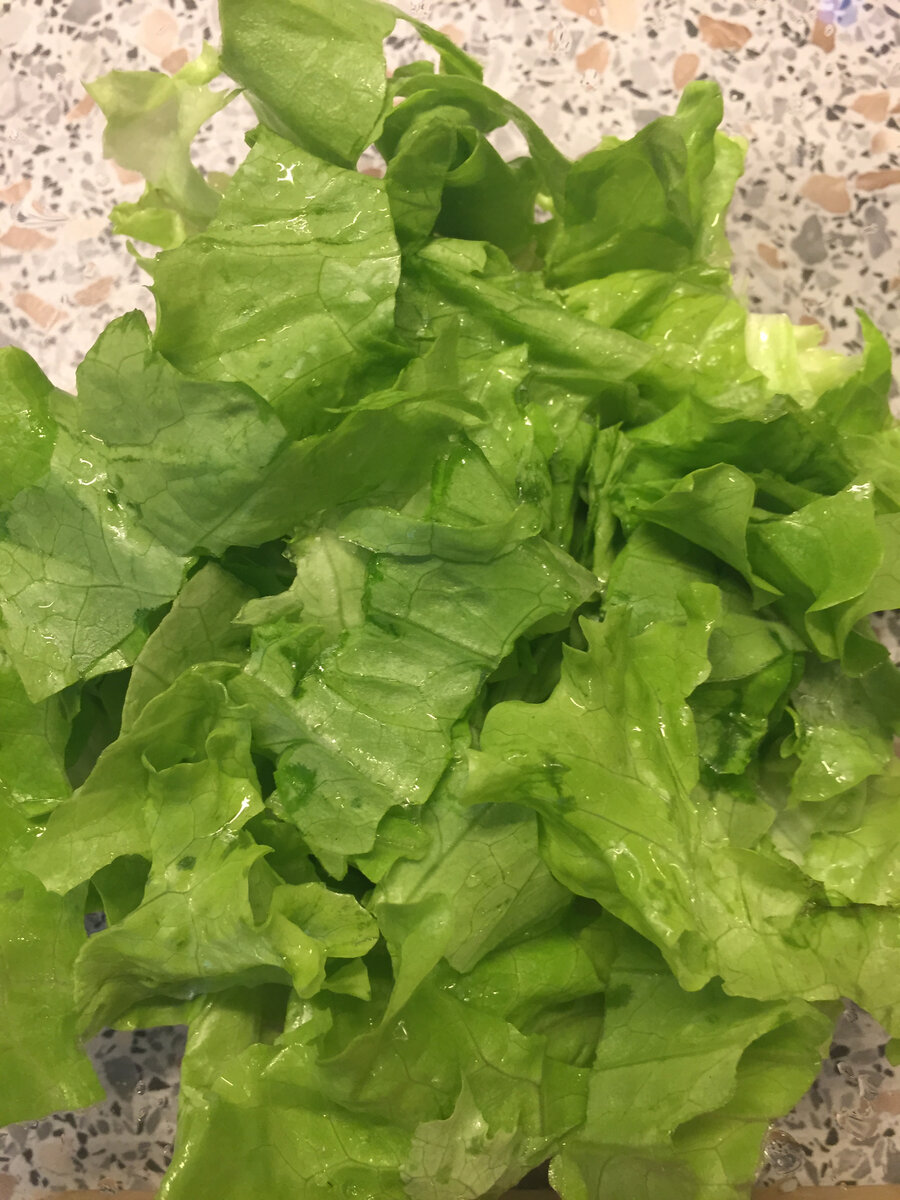 Салатные листья промыть и обсушить на бумажном полотенце. Берем салатницу в которой будет подаваться наш салат и нарвем туда салатные листья.