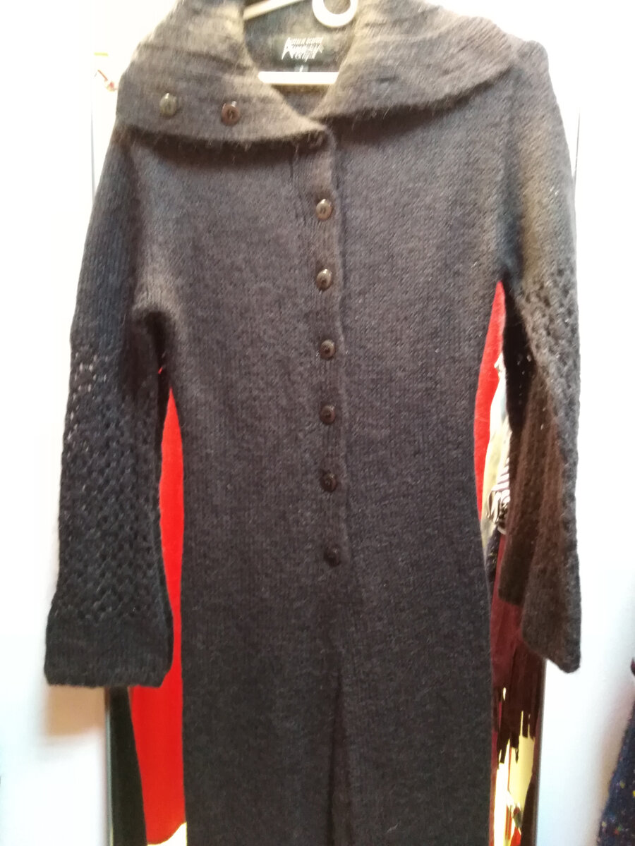 1) Непонятно зачем накануне лета цапнула длиннющий кардиган от бренда Amnesia. Состав 50 на 50 акрил и мохер. На подоле и рукавах ажурная вязка. Без скидок он стоил 1800, со скидкой стал 360 рублей.