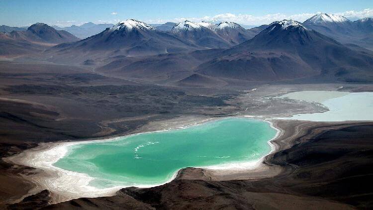 Соленое озеро Лагуна-Верде расположено на юго-западе высоких равнин Боливии. Его название дословно переводится, как «Зеленая лагуна». А все потому, что вода в нем удивительного оттенка зеленого. Озеро находится у подножия вулкана Ликанчабур, а зеленый цвет воды вызван медными отложениями. Озеро славится своими красивыми окрестностями и горячими источниками.