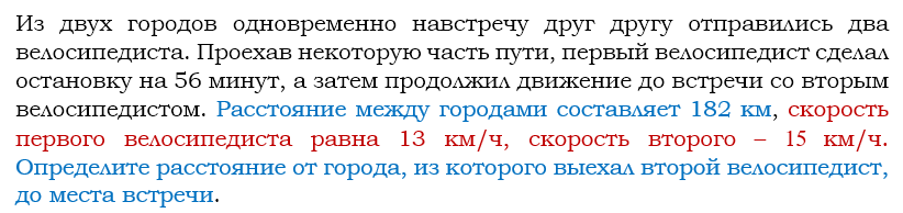 Здравствуйте, дорогие читатели, подписчики и гости канала. В этом выпуске продолжим учиться решать текстовые задачи. Если не понятно, как решать задачи, то пробуйте всегда за неизвестное брать то, что стоит в вопросе задачи. Но в таком случае, могут получиться уравнения, которые будут решаться сложно. Как раз этот случай, рассмотрим в этой статье. Разберем решение такой задачи: Первый способ: За неизвестное (Х) возьмем то, что стоит в вопросе, но это будет неудобно. Почему? Смотрите дальше. Так как за Х взяли расстояние от города, из которого выехал второй велосипедист, до места встречи, то первый велосипедист до места встречи проедет 182-Х. Скорости велосипедистов в таблицу впишем из условия задачи. Заполнив столбцы скорости и расстояния, найдем время. Время равно расстояние делим на скорость. Ко времени первого велосипедиста прибавляем время его стоянки, выраженное в часах. Так как время, которое велосипедисты провели в дороге одинаково, то составим уравнение: Это уравнение решаетс