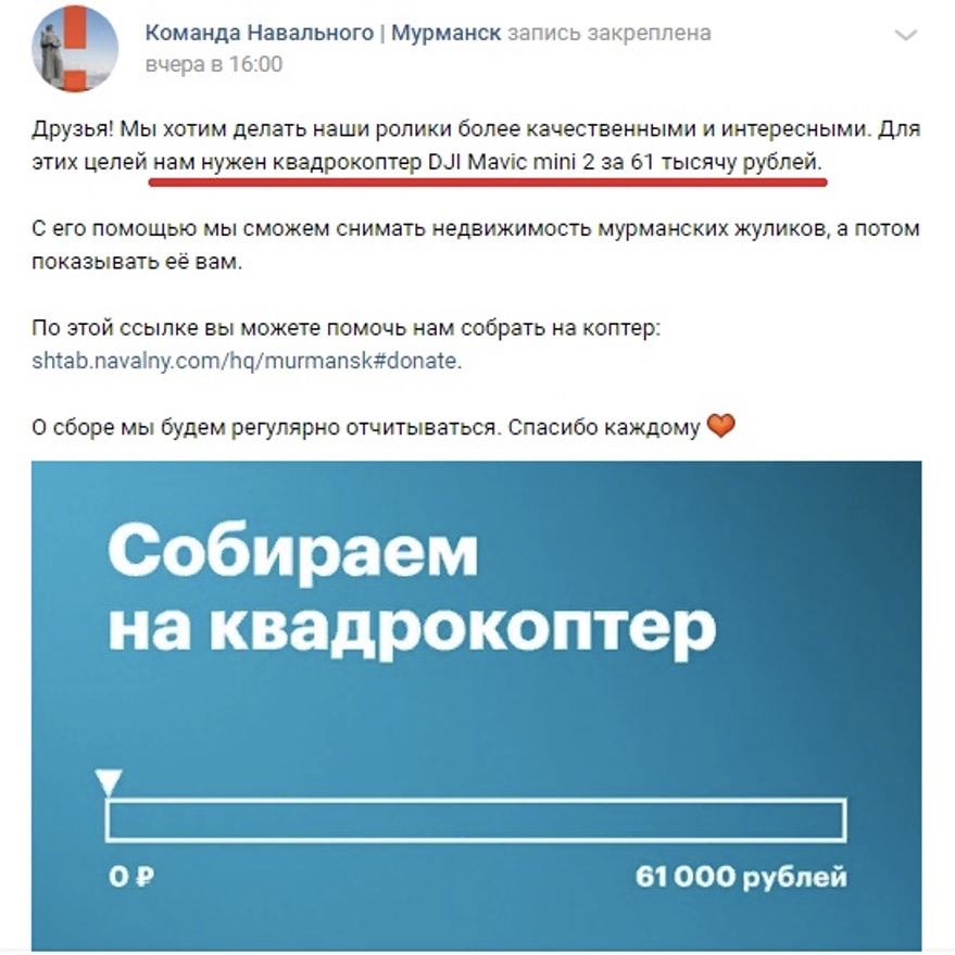 22 марта 2021 года штаб Навального в Мурманске объявил сбор средств на покупку квадрокоптера DJI MavicMini 2 в размере 61 тыс. рублей.