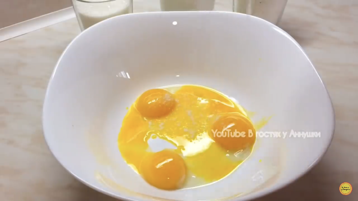 1) Беру 4 яйца комнатной температуры отделяю белок от желтка. Желтки использую для тесто, белки пойдут в крем. Белки нужно отделить аккуратно чтоб желток не попал в белок. Иначе в дальнейшем белок может не взбиться.