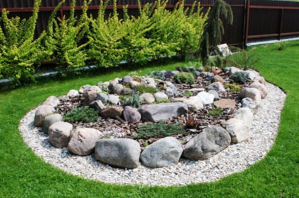 Оригинальные клумбы с камнями преобразят внешний вид дачи.