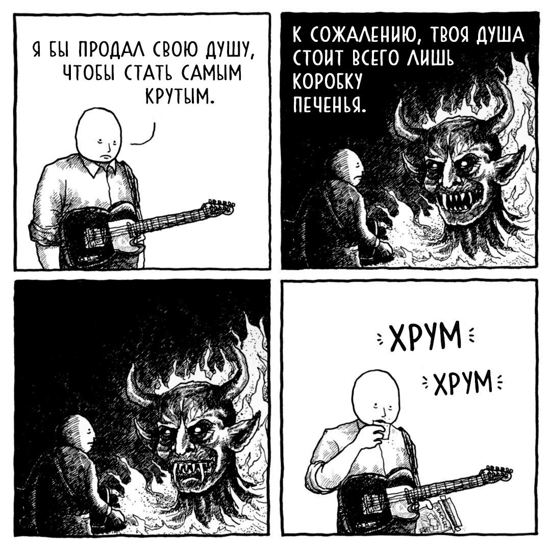 Ирония комикса в том, что человек настолько хотел научиться рисовать ровные круги, что даже решил продать душу дьяволу. Однако у него и вызвать нечистую силу не получилось.