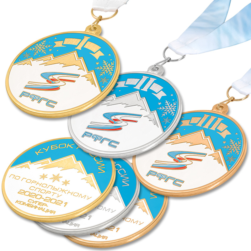 Наша компания разработала и изготовила комплект медалей на Кубок России для Российской Федерации Горнолыжного Спорта. Комплект состоит из медалей разных достоинств. Медали имеют форму правильного круга диаметром 70 мм и выполнены из латуни, нейзильбера и томпака.