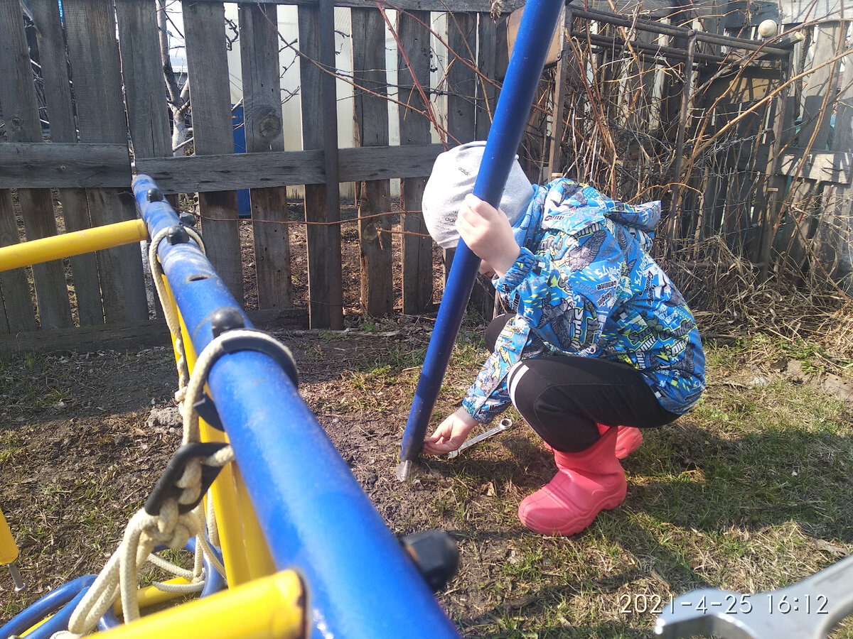 Поэтому, когда в выходные мы установили на улице спортивный комплекс, Паша только качался на качелях, пинал канат и висел на кольцах.