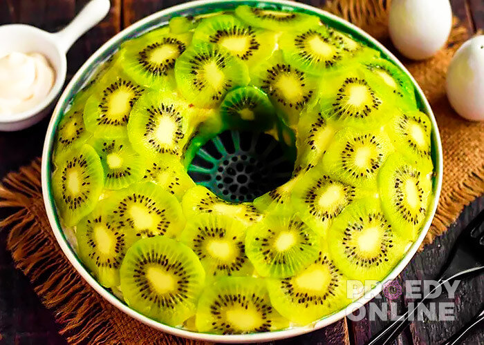 - Почистите оставшиеся киви и нарежьте тонкими кружочками. Выложите эти кружочки как можно чаще местами внахлест, чтобы киви покрыли весь салат без пробелов.