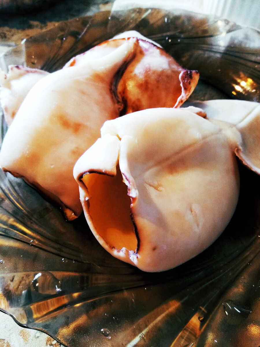 Кальмары на 1 минуту опустить в кипяток, почистить, помыть, снять плёнку.