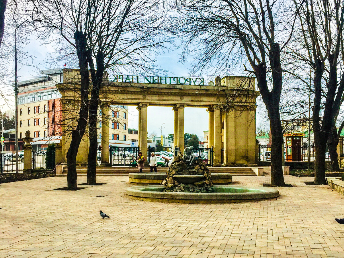 Один из основных входов в Курортный парк расположен на привокзальной площади. Сразу за триумфальными арками с колоннами очаровательная композиция — фонтан с мальчиком, сидящим на каменной горке. Рядом — статуя благородной гречанки: по одним сведениям это Афина, но лично меня лук и колчан со стрелами заставляют предположить что это скорее Артемида (она же Диана) — богиня охоты и родная сестра Аполлона, который был покровителем врачебной науки и всего, что связано с медициной и врачеванием.