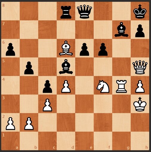 Очередная шахматная задача. У черных лишняя пешка, и два слона. Черные предложили размен ферзей, а так же напали ладьей на белого слона. Но ход белых, белые начинают и красиво выигрывают.