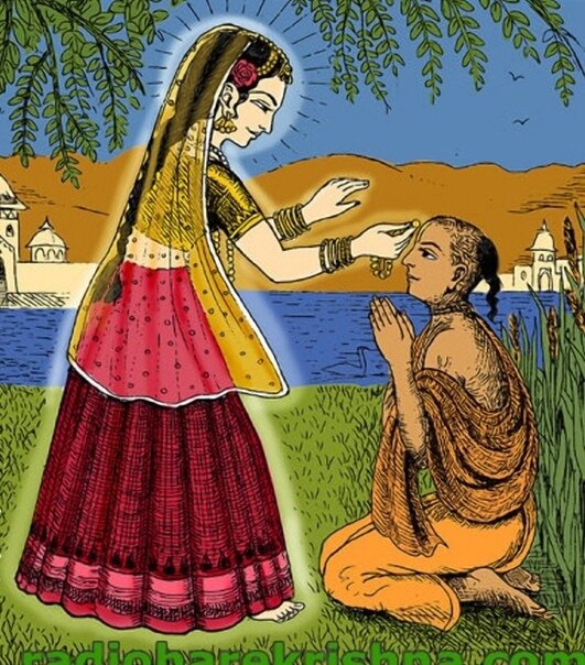 В это время он интуитивно почувствовал, что ему открылась великая тайна. С глазами, полными слез Кришна премы, он распростерся на земле и выразил свое почтение в полном смирении. Его голос прерывался от экстаза, тогда Вишакха деви сказала: « О лучший из преданных, моя подруга очень хотела бы выразить свою благодарность, даровав тебе благословение. Ты можешь просить чего пожелаешь».