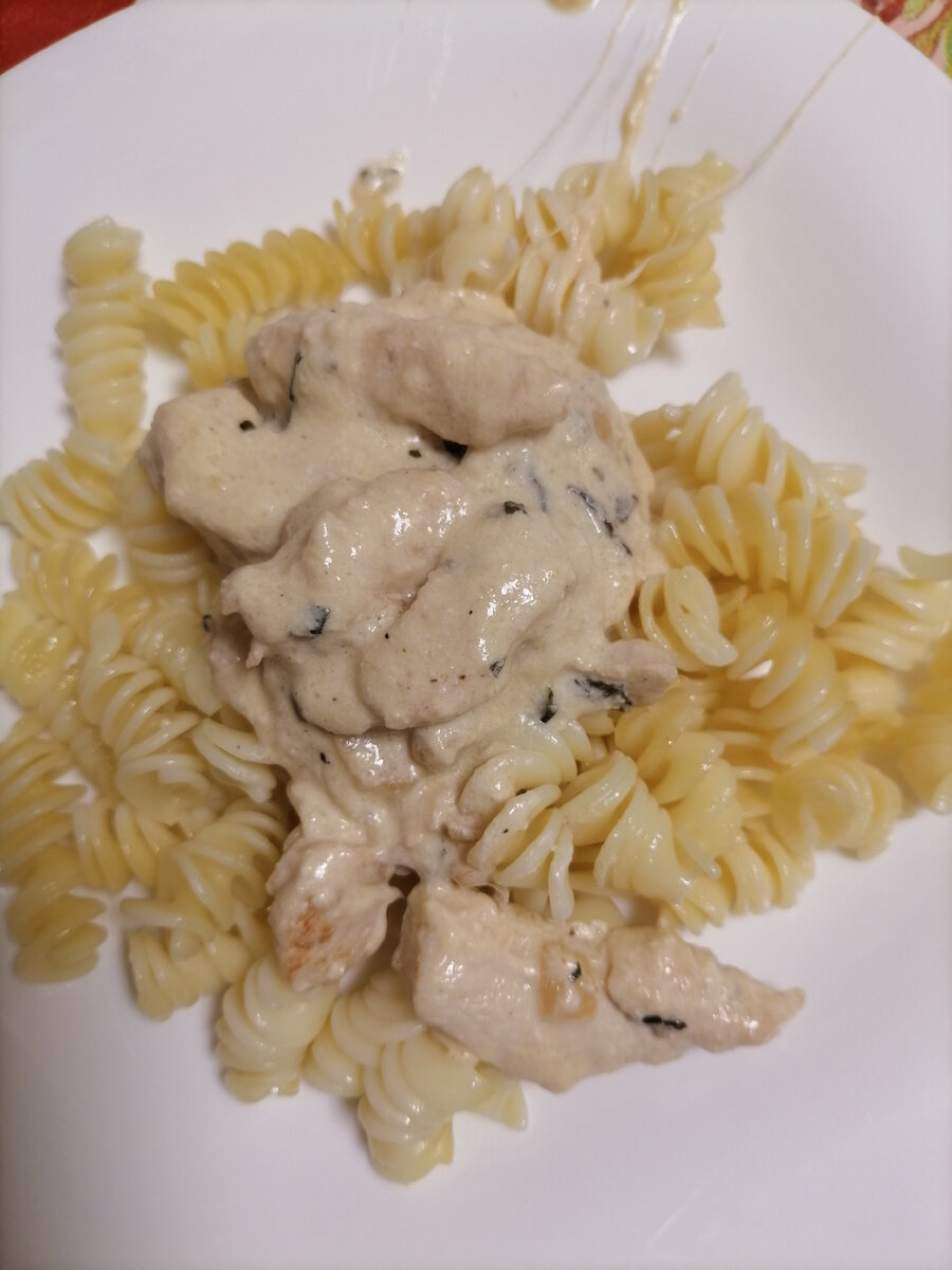 Вкуснее всего соус только что приготовленный. И если не планируете его использовать сей момент, на этом этапе газ можно выключить. Курица готова, сливки не свернулись. Потом надо просто снова довести до кипения...