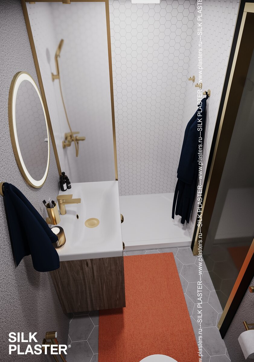 Рассмотрим цветовые решения для прихожей и ванной комнаты. В отделке ванной комнаты часто используется белый цвет или пастельные оттенки. Они ассоциируются с чистотой и свежестью, а также визуально расширяют пространство. К тому же, на светлых покрытиях меньше заметны следы от капель воды. Чтобы дизайн не казался скучным, спокойные тона разбавляют контрастными цветами. С жидкими обоями SILK PLASTER доступны любые варианты цветового оформления ванной.. Широкий выбор оттенков и фактур позволяет внести индивидуальность в любой интерьер. На фото - стены ванной комнаты покрыты универсальной штукатуркой MIXART. Материал уникален тем, что подходит для оформления и интерьера, и экстерьера. Штукатурку можно использовать в любых помещениях, в том числе и с повышенной влажностью. Mixart обладает высокой износостойкостью и устойчивостью к перепадам температур. При желании покрытие можно сделать идеально гладким и при этом сохранить визуально его текстуру. Коллекция отличается невероятной фактурой