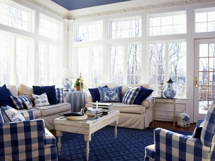 Стиль гжель-интерьера прекрасно реализуется на основе какого-то другого направления: например, на базе современного и скандинавского стилей интерьера, минимализма или прованса. Великолепно сочетаясь с любыми оттенками и текстурами дерева, а также с золотым напылением, орнамент отлично гармонирует с белоснежной базой этих стилей.