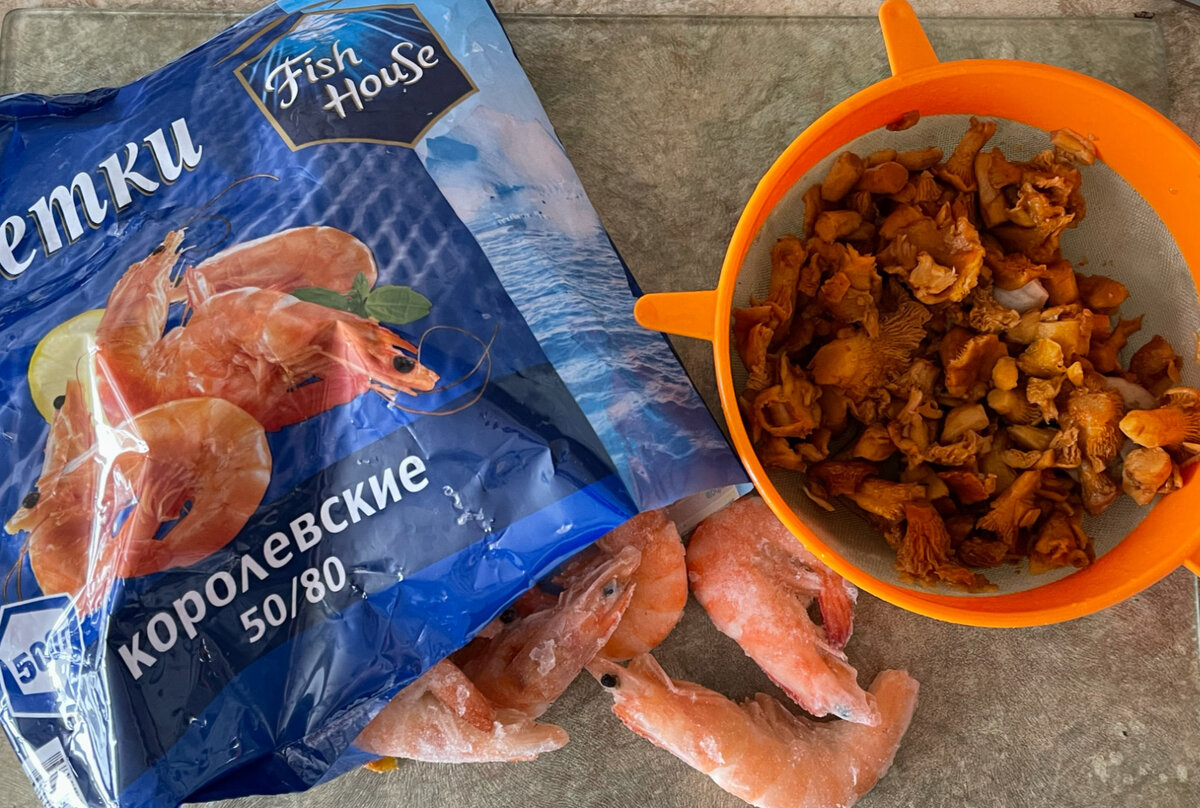 Вообще, лисички–это универсальный гриб. Он сочетается со всеми овощами, мясом, рыбой и в нашем случае - с креветками. А уж насколько они полезны, думаю и говориться не стоит. Упомяну только то, что в них масса полезных витаминов, которые помогают улучшить зрение, а для меня это очень важно. Лисички я собираю сама, в лесу около дачи, и замораживаю их, чтобы в течении зимы спокойно можно было позволить себе приготовить вкусные блюда. Но можно их найти и в любом супермаркете, обычно они лежат в ларе для заморозки или продаются сушёными.