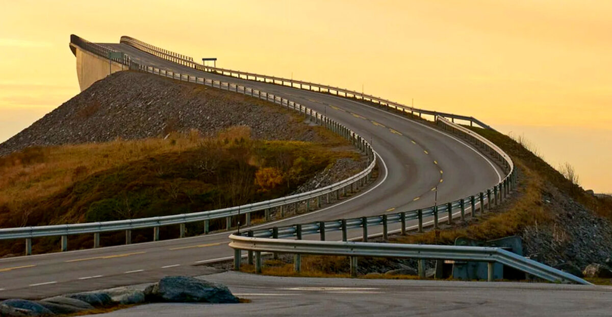 Вот такая картина открывается с определённого ракурса. Да-да, это тот самый «мост в никуда». Нередко попадает в самые разнообразнее ТОПы. Он растянулся на 260 метров, отклоняясь на некоторых участках в сторону до 23 метров: бетонная змея из восьми мостиков, проезд по которой то ещё испытание особенно в туман и ураганный ветер.