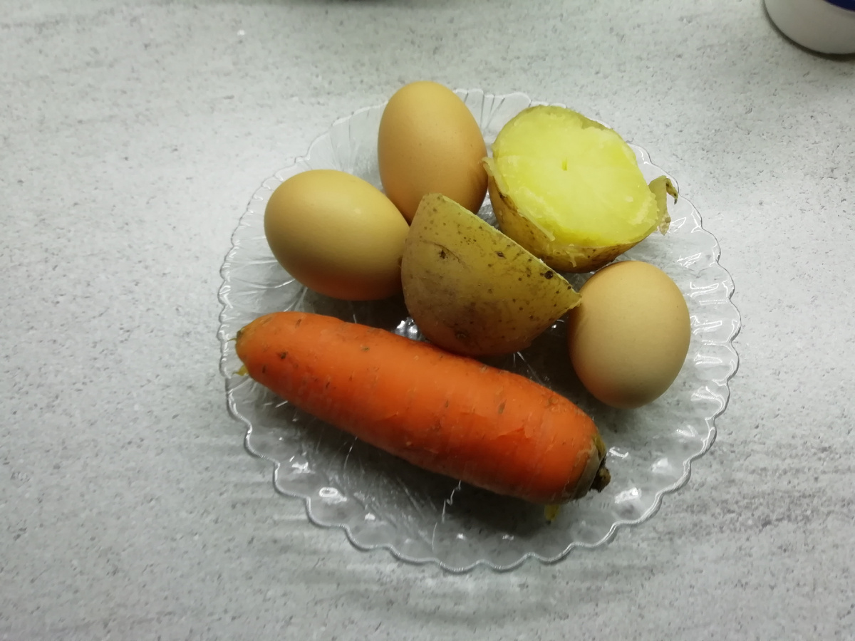 Отварите картофель, морковь и яйца. Очистите.