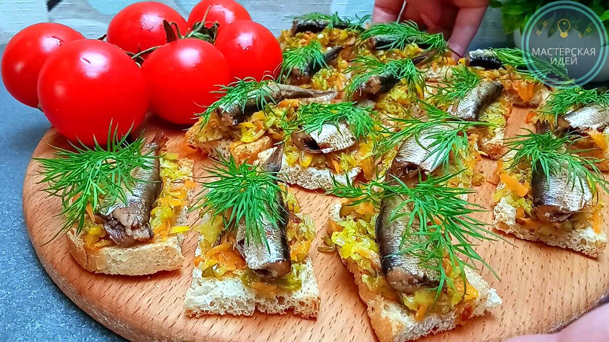 Закуску из соленых огурцов и моркови с луком выкладываю на подсушенный хлеб, сверху кладу шпроты