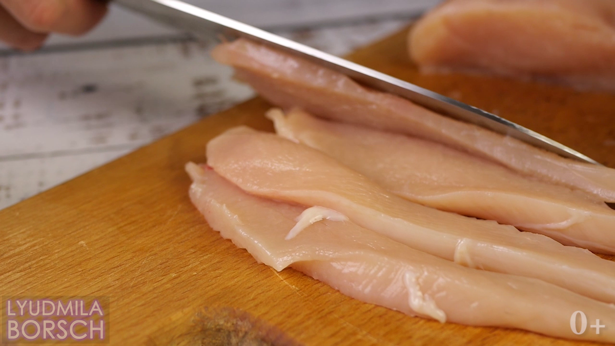 Салат из простых продуктов на Пасху или на любой праздник. Уж очень Вкусный САЛАТ! Съедят за минуту. Эта салат закуска разлетается со стола очень быстро. С ума сойти, так просто и вкусно, что готовить можно каждый день. Всего 4 продукта в составе, а так вкусно получается. Этот салат закуска бесподобен. Все мои гости были в ВОСТОРГЕ от такого сытного и вкусного салата. Это просто бомба! Салат очень сытный, нежный, а самое главное быстрый в приготовлении. Готовится из самых простых продуктов, но его можно приготовить и к праздничному столу. Такая закуска чудесно подойдет для фуршетов, она будет замечательным украшением любого праздничного стола. Попробуйте приготовить, а я буду очень рада, если вам понравится рецепт. Желаю Вам приятного аппетита и веселых праздников. Не потеряйте рецепт – ПОДПИШИТЕСЬ на канал и первыми получите новые, интересные и точные рецепты. Будет еще много всего интересного. Куриное филе помоем, обсушим бумажным полотенцем и нарежем на вот такие кусочки, можно ск