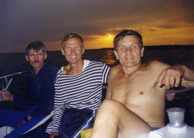 На фото слева - капитан, он же хозяин яхты «Мираж» прапорщик Морской авиации Сергей Малов; справа — врач команды, он же матрос, боцман и кок Виталий Решетников; по центру — юнга полковник Чечель, по совместительству старший помощник кока; фотограф — племянник юнги, Александр Чечельницкий (Иркутск), он же младший помощник кока; грозу мышей и пожирателя сметаны дворового кота Василия, он же сторож на пол ставки, списали на берег как провинившегося - (сожрал палку колбасы).