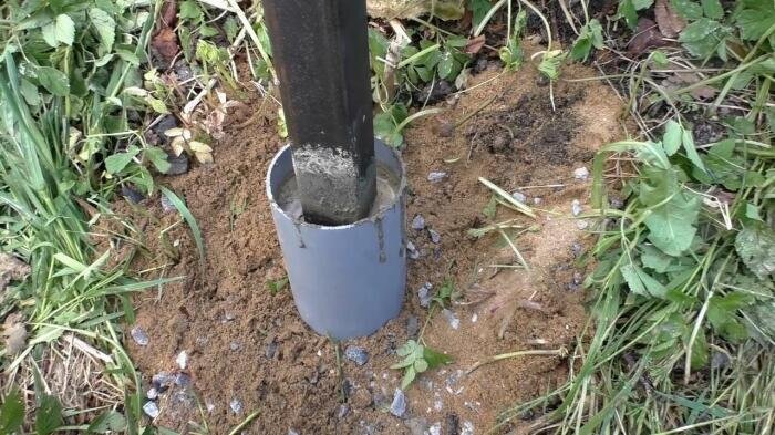 Чтобы зимой столб не выдавливало, важно бетонирование осуществлять 2-мя диаметрами. Задаются они буром (диаметр внизу 18 сантиметров) и трубы ПВХ (диаметр вверху 11 см).