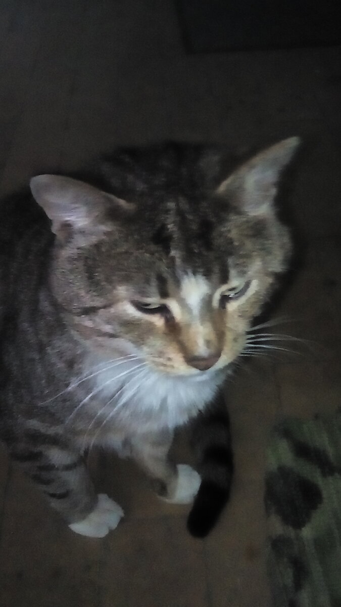 Он такой милый коток с полосками на мордочке и спине и с белой полоской на лбу.