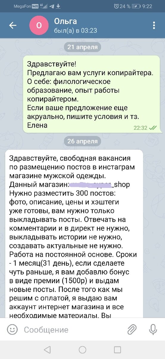 Я проверила магазин одежды в инстаграме, такой действительно был. Меня смутило, что магазин уже достаточно наполненный. Хорошо, переписка продолжилась.