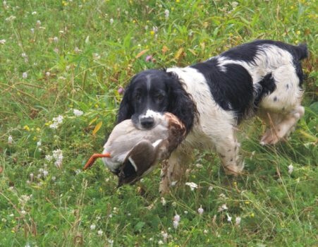 Теперь крайне важно научить спаниеля приносить подбитую дичь, для этого сначала нужно натаскать спаниеля на подачу с воды, а затем уже с суши, спаниели предпочитают водную охоту. Когда спаниель поднимает птицу с воды, он никогда ее не оставляет пока не донесет до берега, так он закрепит, что поноску нужно доставить хозяину. Спаниели бывают брезгливые к перьям, и если начать с суши, то это может занять больше времени, а иногда и вовсе пес не хочет ее подавать. Подстреленную на воде дичь, можно использовать несколько раз, пес приносит ее после выстрела, а вы снова кидаете ее в воду для тренировки. Можно пробовать принесенную дичь из воды сразу кидать на сушу, иногда собаки с удовольствием ее начинают приносить. Но если этот метод не работает и на суше спаниель отказывается носить дичь, есть иной метод. Чтобы вызвать азарт и ревность, нужно попросить к вашей убитой на земле дичи подойти другого охотника с уже натасканным псом. Как правило, такой метод срабатывает на всех брезгливых спаниелей, ведь заметив потенциального противника, который хочет отобрать добычу, спаниель побежит за дичью и принесет ее.