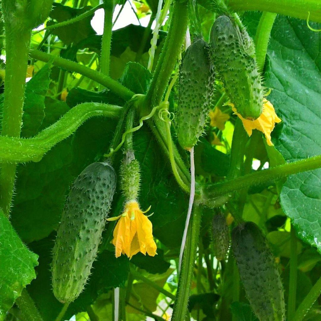 где только-только появились всходы. Неделю назад я их вот сеяла, а есть рассада которой четыре недели с момента всходов, а есть огурчики которые уже дают урожай, они были посеяны феврале месяце, то есть дома я их вырастила рассадой пересадила в 7 литровые горшки и они прекрасно сейчас у меня в теплице дают урожай посмотрите.