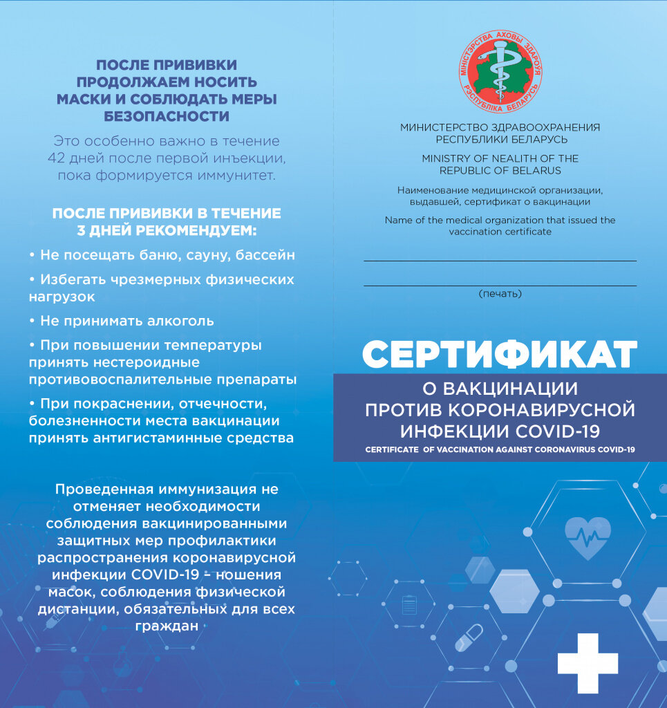 Вот так выглядит сертификат о вакцинации от коронавируса COVID-19, если сделать ее в Беларуси.