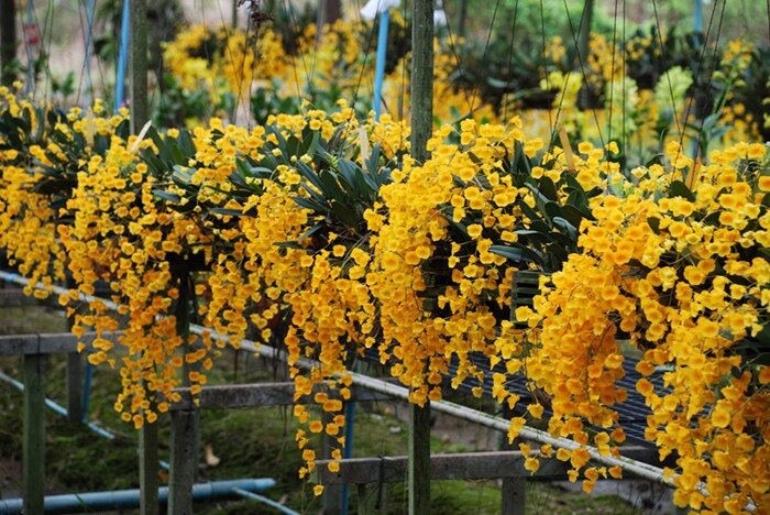 Его короткие, продолговато-округлые стебли, около 8 см в высоту, похожи на бульбы. На каждом стебле растет всего один продолговатый кожистый лист. На длинных висячих цветоносах расположены золотисто-желтые цветки с крупной опушенной губой. Цветки имеют приятный аромат.
