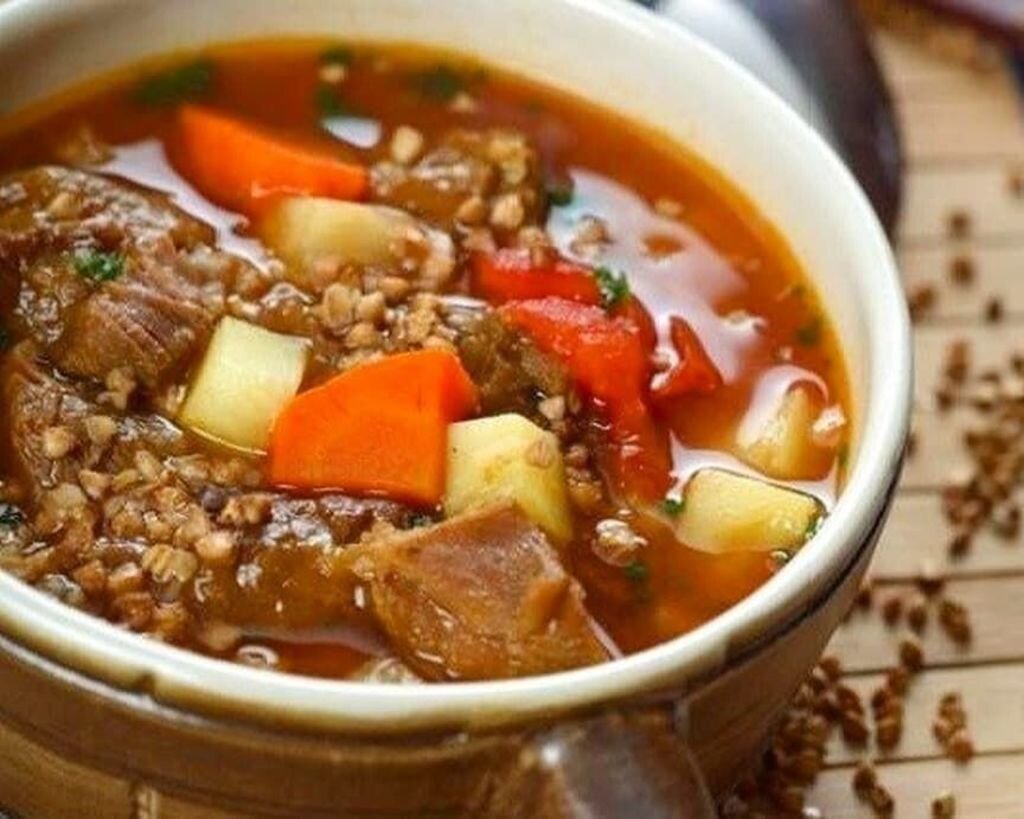🥗Бульон процедить, довести до кипения и всыпать гречку. Добавить обжаренные овощи, картофель и мясо. Варить до готовности