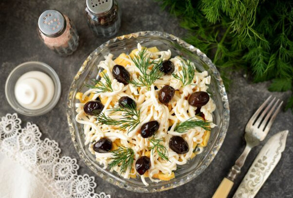 Если куриное филе заранее отварить и остудить, то вам нужно будет всего лишь нарезать остальные ингредиенты и выложить их слоями. Как часто смазывать слои майонезом и когда солить — решать вам. Я советую перед подачей салат перемешать, на мой взгляд, так вкуснее. Сыр в этот салат каждая хозяйка кладет по своему вкусу, можно взять твердый, плавленый, брынзу или