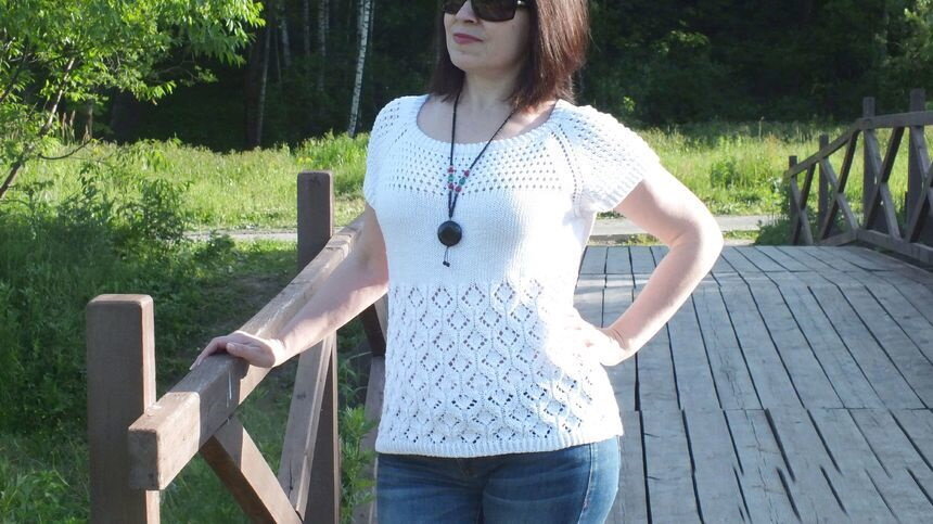 Дорогие рукодельницы! Приветствую вас на своем канале! Я предлагаю вам связать отлично сидящий и прилично смотрящийся топ спицами. Эта модель хороша и в повседневной носке, и для торжественных случаев. Топ можно носить с брюками, джинсами, шортами, юбками. В общем, сфера применения весьма обширна! Эту вещь можно назвать также и летней футболкой, и летним джемпером с короткими рукавами. Но суть и способ вязания от этого не меняется! Использована Семёновская пряжа "Лилия", 100% мерсеризованный хлопок, 392м/100г. В две нити. Расход пряжи. На размер 46-48 (российский) у меня ушло 376 г пряжи. Инструмент - спицы 4,0 мм для основного полотна и 3,0 мм для резинки. Топ связан регланом сверху, с ростком. В топе можно увидеть 4 узора: