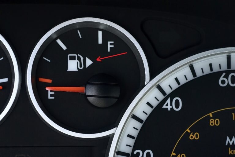 У пиктограммы бензоколонки на приборной панели есть треугольный значок. Он показывает с какой стороны располагается бензобак автомобиля.