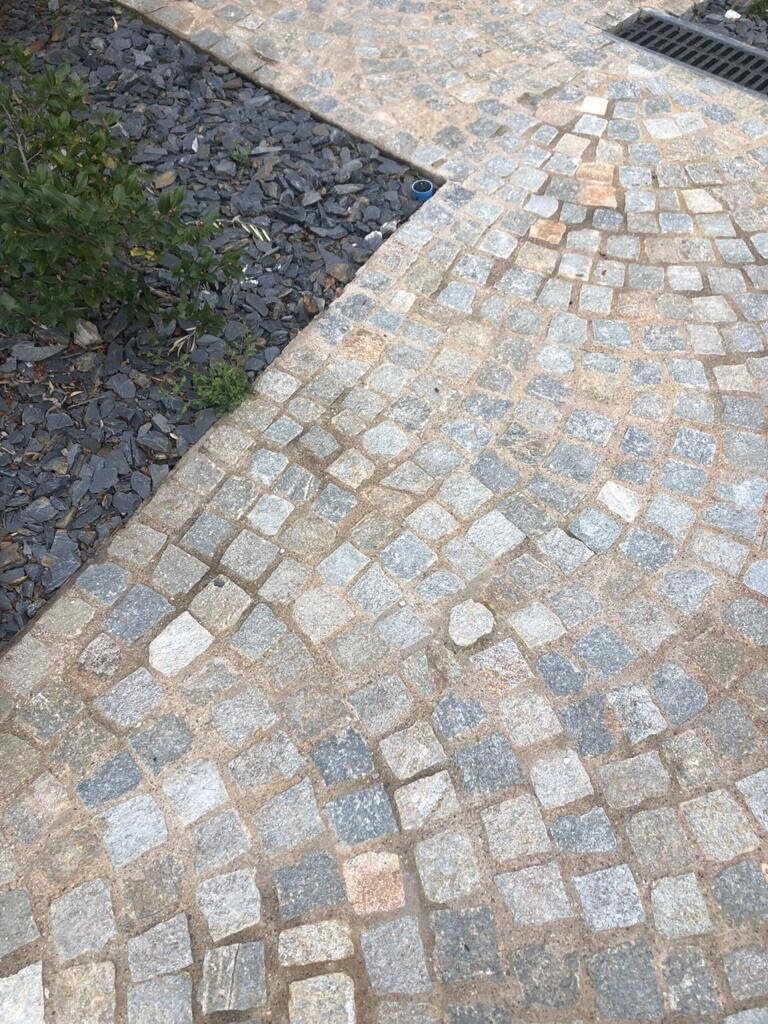 Ошибка №2. В случае, когда используется качественная ЦПС, но отхождение брусчатки все равно произошло – это явный признак несоблюдения технологии мощения и ее нюансов. Возможно, ошибка была допущена на этапе ручной прессовки брусчатки с равномерной проливкой мощения. Если брусчатку вовремя не пролить для бетонации и в это время пойдет дождь, то обильная влага быстро размывает цементные частички в ЦПС, из-за этого мощению не будет обеспечена полная адгезия. Когда ЦПС высохла, она перестает работать и уже не схватывается с брусчаткой. Очень скоро с момента эксплуатации, мощеная территория с такими ошибками начнет играть.