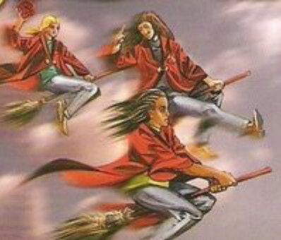 Игрок, спасясь от Нападалы (бладжера), повисает на метле вниз головой, цепляясь за древко руками и ногами.