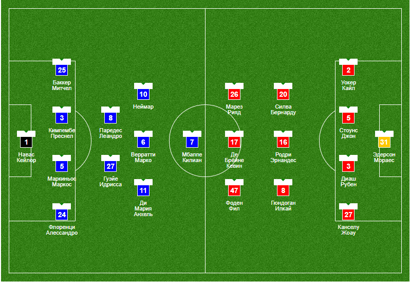 «Пари Сен-Жермен»: Навас, Флоренци, Маркиньос, Кимпембе, Баккер, Паредес, Гейе, Ди Мария, Верратти, Неймар, Мбаппе. «Манчестер Сити»: Эдерсон, Уолкер, Стоунз, Диаш, Канселу, Б. Силва, Родри, Гюндоган, Де Брёйне, Марез, Фоден.